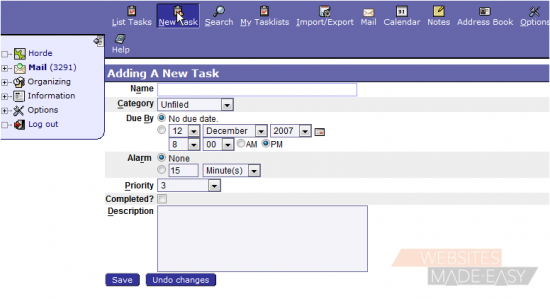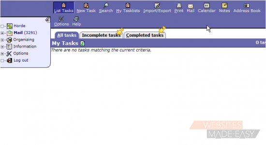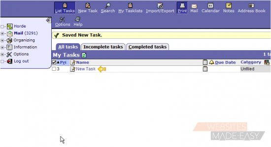This tutorial assumes you've already logged in to Horde webmail. Now let's learn how to create tasks. Adding a task is equivalent to adding to a To Do list. It gives you a reminder of upcoming tasks