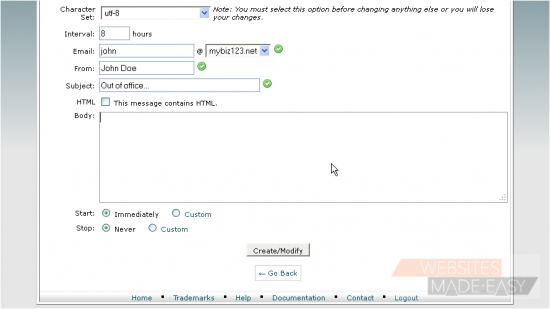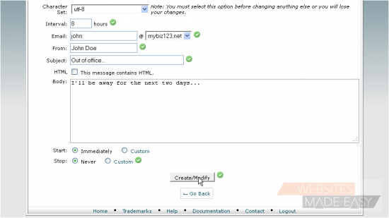 Now when someone sends an email to john@mybiz123.net, the "Out of Office" email will automatically be sent to them