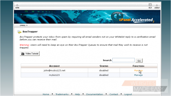 2) To enable BoxTrapper for an email address, click Manage