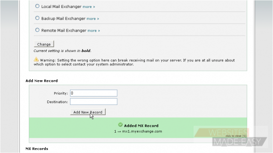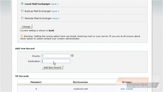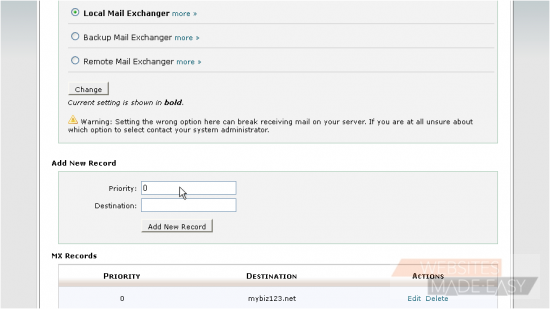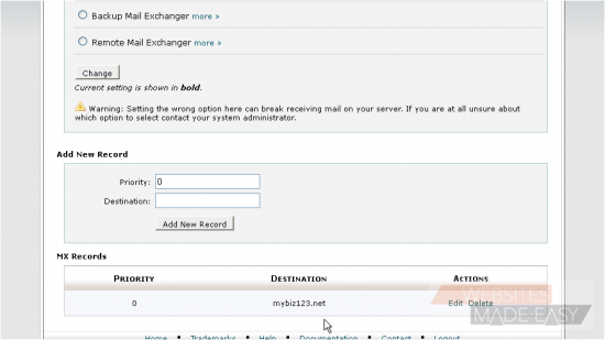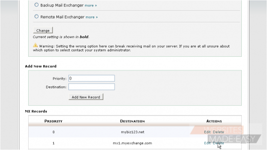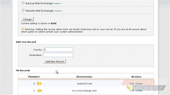 So in this case, the default mail.mybiz123.net mail server will be tried first because it has a priority of 0 followed by the new mail server mx1.myexchange.com, because it's priority number is set to 1. You can return to this page at any time to make changes to your MX entries and their priorities...