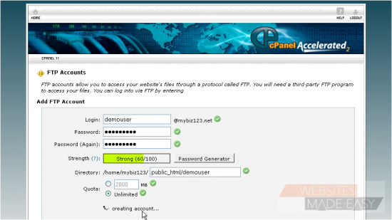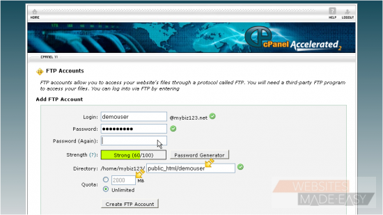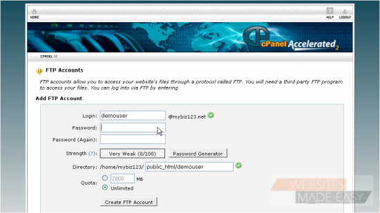 If you leave /demouser in the directory box, then the user of this FTP account will only have access to the /demouser directory, and all folders under it. To give the user access to the entire website, you would delete everything except the forward slash "/". You can put a quota limit on this FTP account if you wish