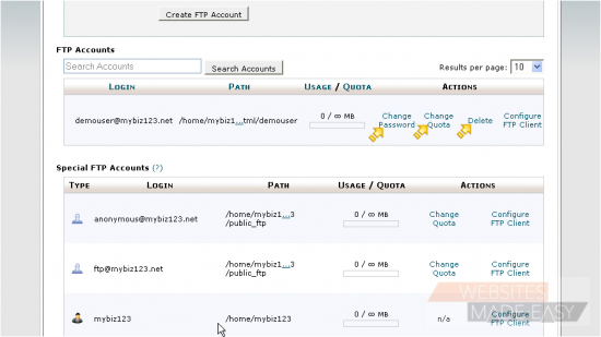 5) From here you can change the FTP account's password, change it's quota, or delete the account altogether