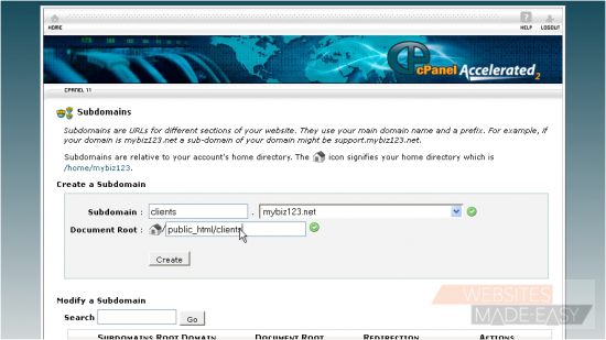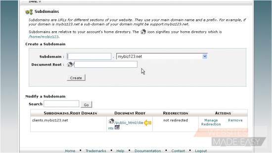 A folder called "clients" has also been created, which is where you would upload files for this subdomain. It's located in the public_html directory, and can also be accessed like this:www.mybiz123.net/clients