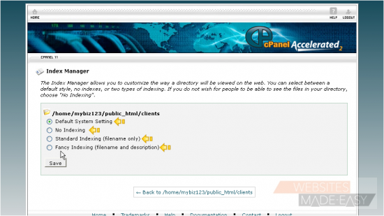 There are 4 settings to choose from: Default System Setting - allows the directory contents to be shown, No Indexing - does not allow directory contents to be shown, Standard Indexing (filename only) - Prevents browsers from viewing the contents of directories that do not contain image files, Fancying Indexing - Prevents browsers from viewing the contents of directories that do contain image files