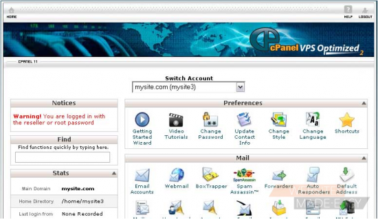 Among the most widely used web hosting control panels are cPanel (shown here), Parallels Plesk, and DirectAdmin. Some control panels only run on Linux, some are meant for Windows, and some will work with both types of operating system.