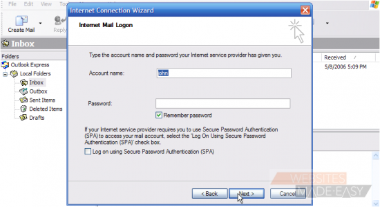 12) Now enter the email username as provided to you by your hosting provider..... this may be the entire email address (john@demo1234.com), or just the username prefix (john)