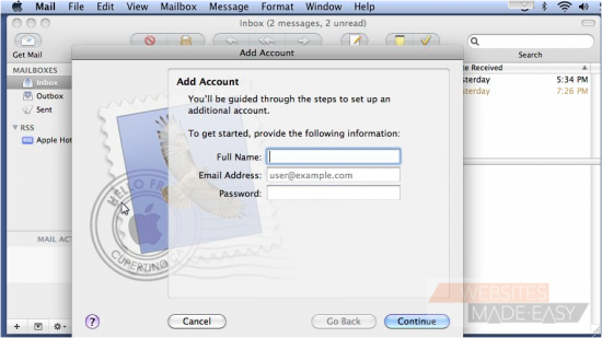 2) Type your name as you want it to appear... enter your full e-mail address... then type the password associated with this account. When ready, click Continue.