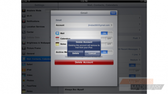 4) Press here to confirm you want to delete the account. Note: Deleting an email account from your iPad will also remove all messages that were in your iPad.