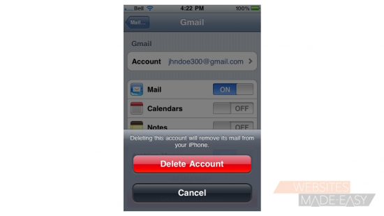 5) Press the red button to confirm you want to delete the account. Note: Deleting an email account from your iPhone will also remove all messages that were in your iPhone.