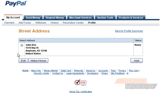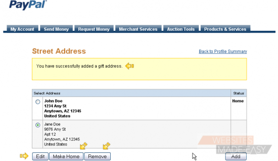 You will get a confirmation email and an on-screen notification. You can edit your addresses by selecting them and clicking the Edit button... set an address to be your home address by clicking the Make Home button... or you can remove the selected address by clicking the Remove button