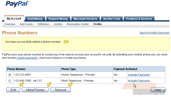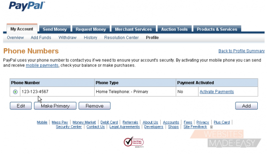 This screen allows you to add, edit or remove phone numbers or set one as your primary number
