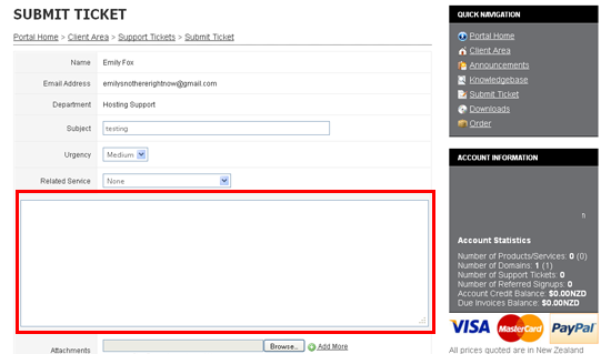 This is the Support Tickets area where we can create tickets and send them to the department of our choice